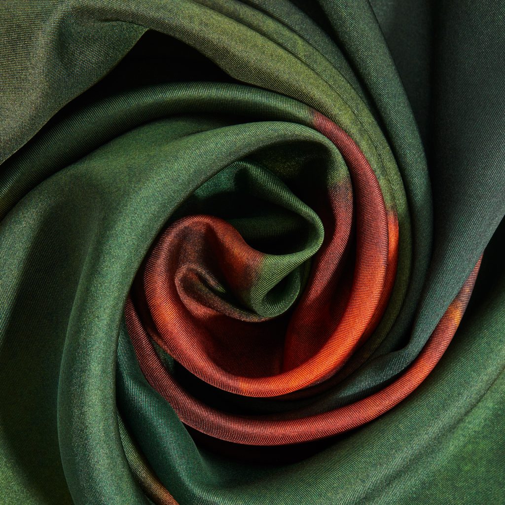The original artwork were made entirely manual on canvas, using acrylic paints. It is translated in digital file and printed on premium European silk, in a small manufacture, where skilled seamstresses finishes them, with an elegant roll-hem.